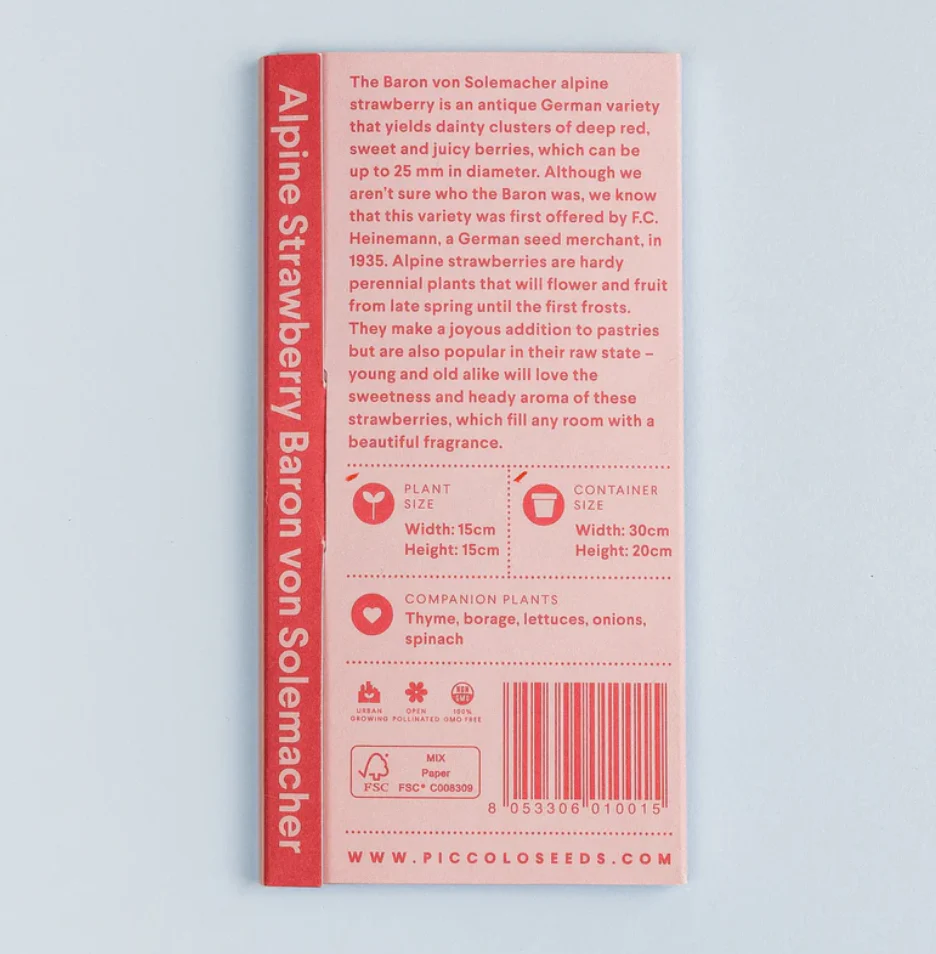 Although we arenât sure who the Baron was, we know that this variety was first offered by F.C. Heinemann, a German seed merchant, in 1935. Alpine strawberries are hardy perennial plants that will flower and fruit from late spring until the first frosts. Itâs also an early-fruiting variety â the first strawberries may develop as quickly as 3 months after sowing.